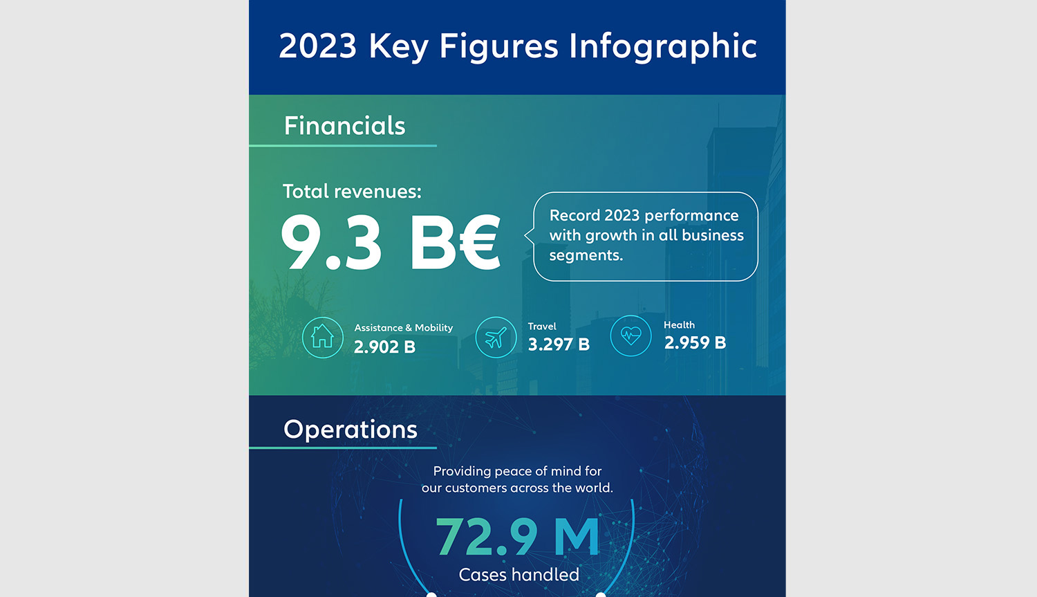 Il business Roadside Assistance ha registrato una forte crescita nei mercati europei, in particolare in Francia, Spagna e Svizzera, e in America Latina, soprattutto in Brasile. Il business Home ha registrato una buona performance in tutta Europa, soprattutto in Germania e Austria, oltre a una crescita sostanziale in Australia. Anche Easy Living, che fornisce servizi per la vita quotidiana come il supporto alla riabilitazione, è cresciuta rispetto all'anno precedente, soprattutto grazie a nuovi clienti Eastern Europe. Il settore Mobile Device and Digital Risk (MDDR) è rimasta complessivamente stabile, con una crescita significativa in India, Spagna e Francia, compensata dal riassetto del portafoglio in alcuni mercati. Mobility ha registrato un aumento dei ricavi dell'8%, grazie alle relazioni con i clienti esistenti, ai nuovi clienti nei mercati target europei e asiatici, all'embedded insurance e alla crescita delle coperture speciali, in particolare quelle relative alla nuova mobilità e alla micromobilità. La linea di business Mobility è entrata con successo anche nel mercato statunitense, con ulteriori opportunità di crescita nel 2024.